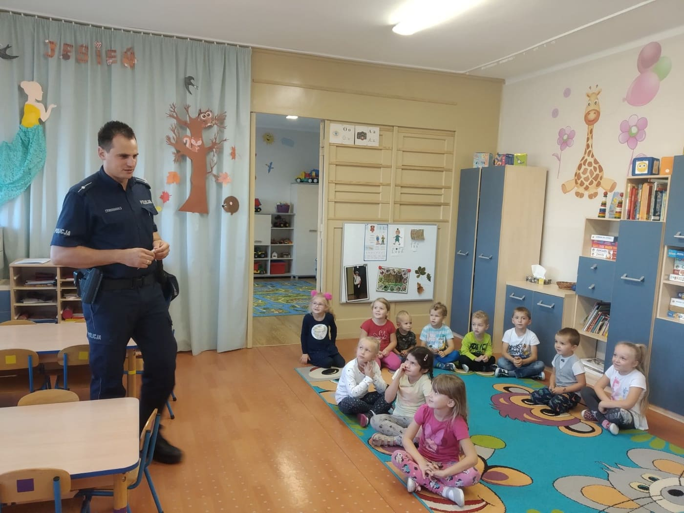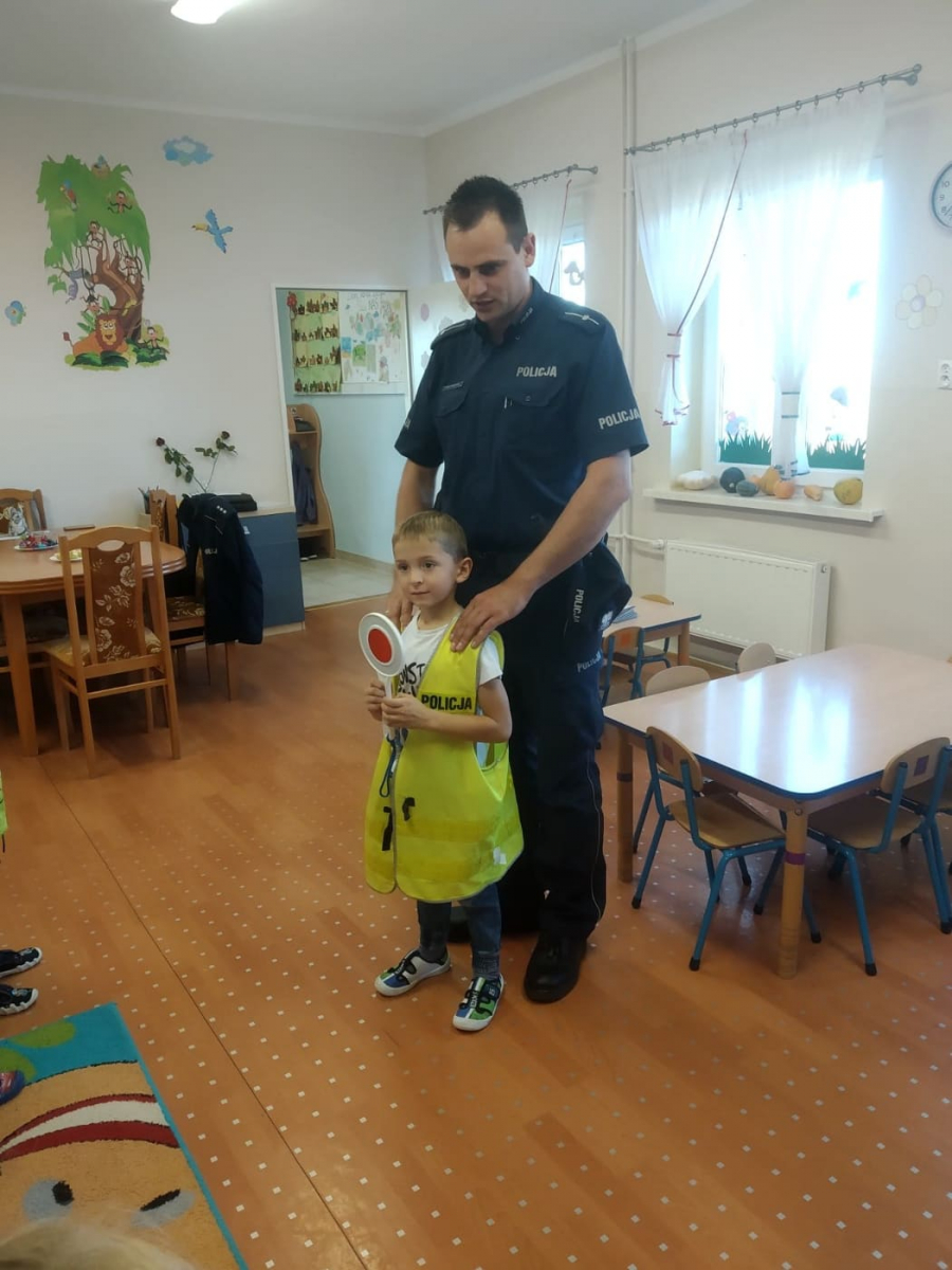Dnia 17.10.2019r. na zaproszenie dzieci i nauczycieli przybyli do naszego przedszkola policjanci z Komendy Policji w Raciborzu. Podczas spotkania przedszkolaki dowiedziały się jak ważna, odpowiedzialna i niebezpieczna jest praca policjanta . Panowie policjanci opowiedzieli dzieciom o zasadach bezpieczeństwa w domu, w przedszkolu oraz przybliżyli zasady bezpiecznego poruszania się po drodze. Wyjaśnili jak należy zachować się w kontaktach z obcymi ludźmi oraz pieskami, które mogą stwarzać zagrożenie. Dzieci z dużym zainteresowaniem słuchały rad i wskazówek zaproszonych gości. Na pamiątkę spotkania wszystkie przedszkolaki otrzymały książeczki o zawodzie policjanta. Jednak najlepszym prezentem dla nich okazała się możliwość wejścia do radiowozu policyjnego.