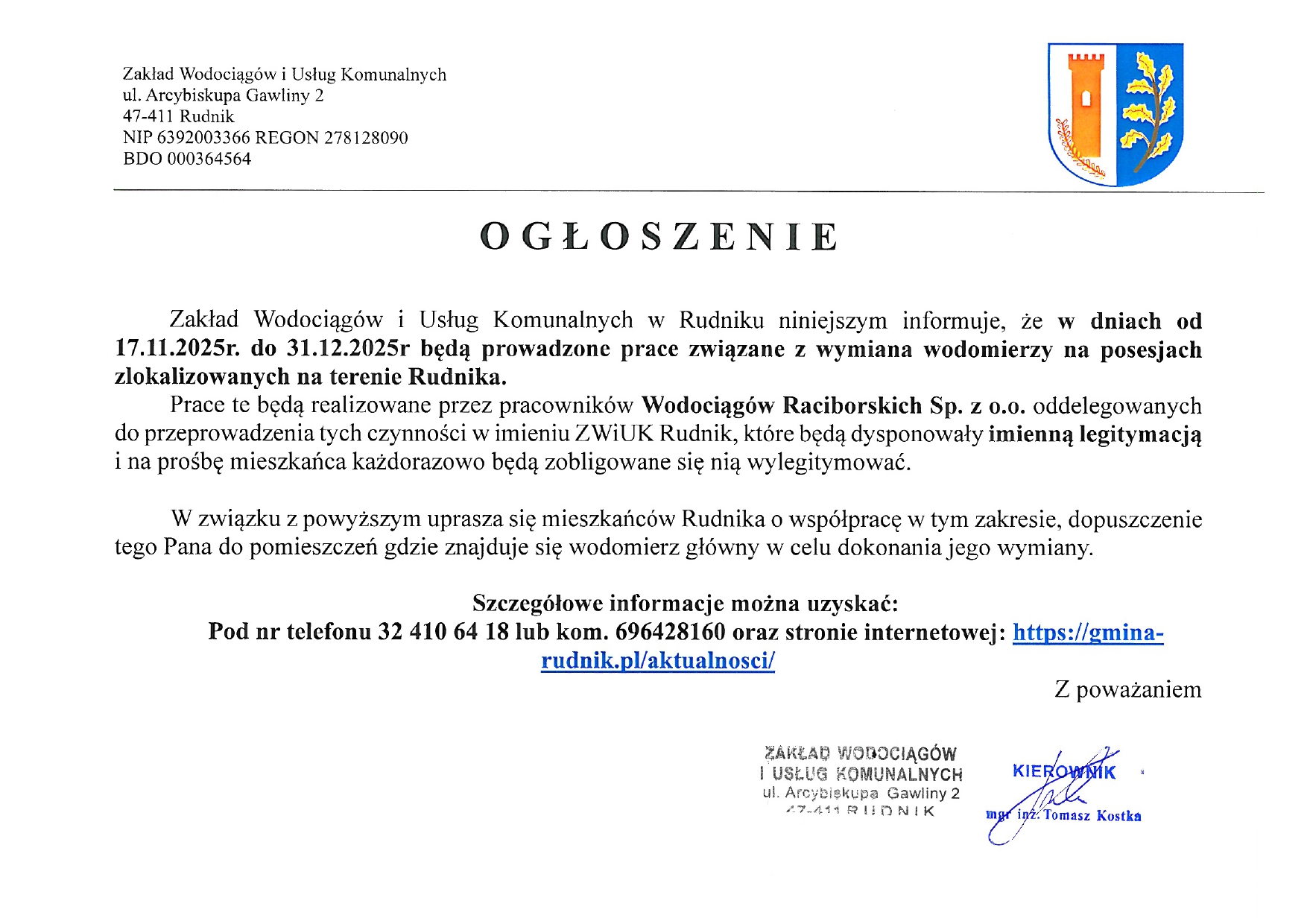 Komunikat ZWiUK ws wymiany wodomierzy w sołectwie Rudnik