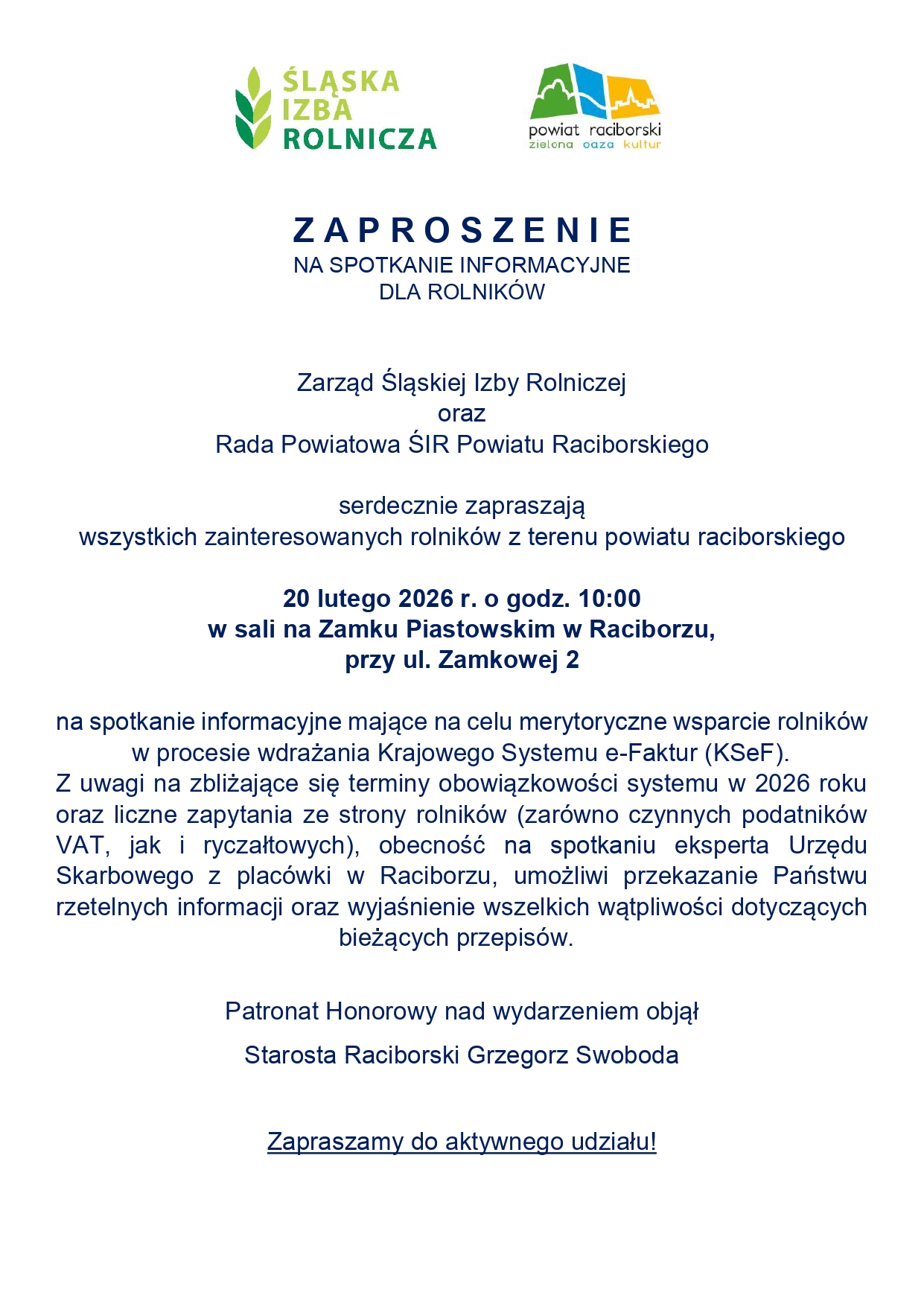 Śląska Izba Rolnicza zaprasza wszystkich rolników na spotkanie ws wdrażania Krajowego Systemu e-Faktur (KSeF)
