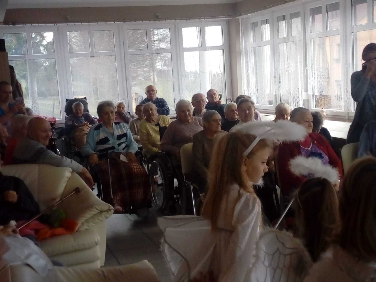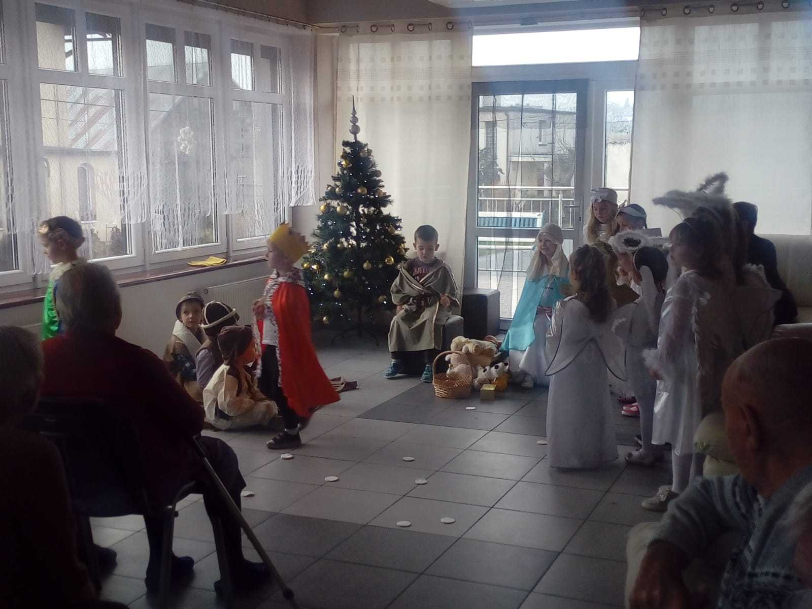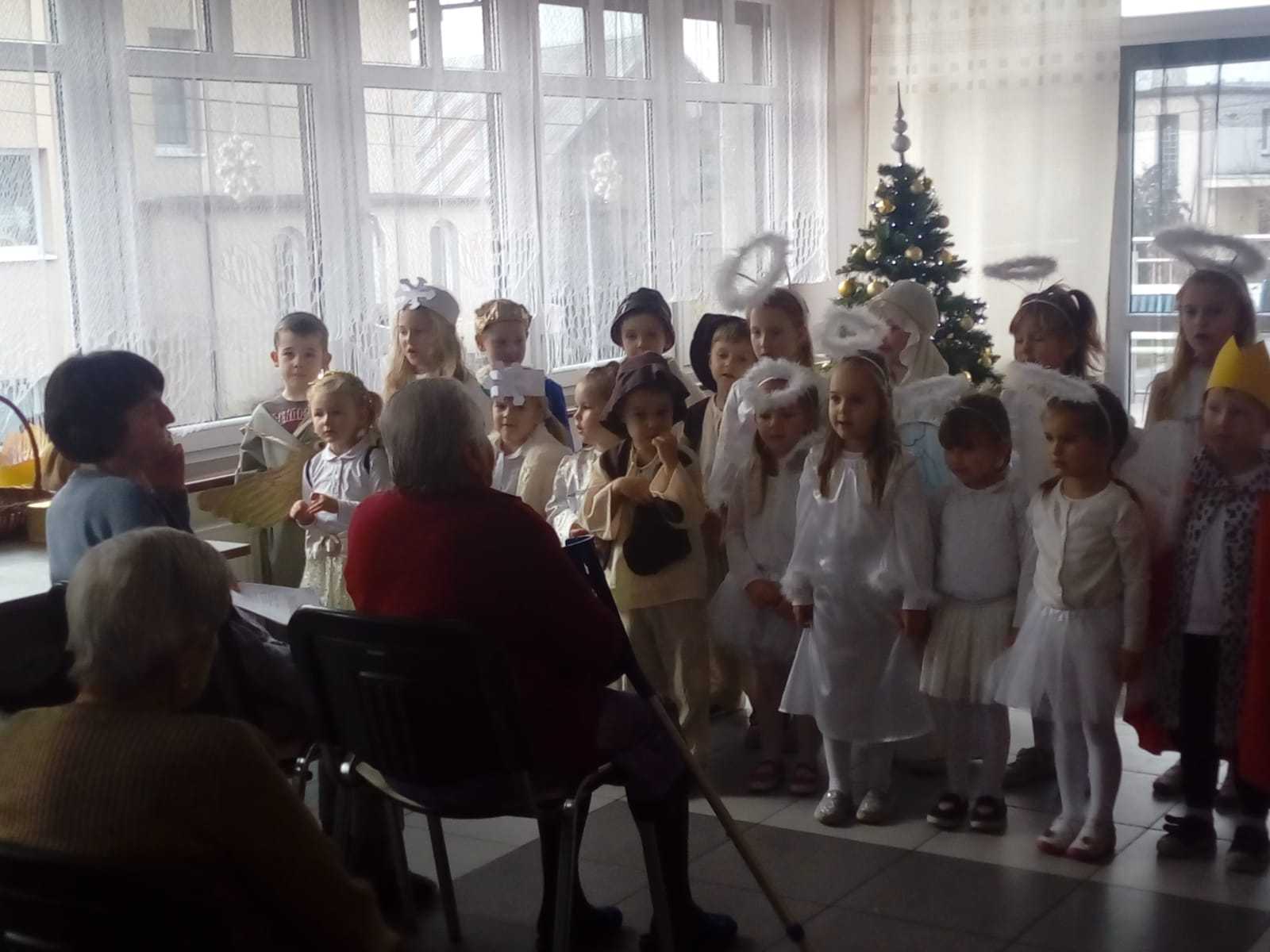 Dnia 17 grudnia przedszkolaki miały zaszczyt wystąpić ze swoim przedstawieniem jasełkowym przed starszymi ludźmi z Domu Opieki „Domowe Zacisze”. Dzieci pięknie przebrane recytowały swoje role, śpiewały kolędy, a na zakończenie podarowały pensjonariuszom samodzielnie zrobione kartki świąteczne z życzeniami oraz paczuszki z pierniczkami, które przedszkolaki również samodzielnie upiekły w przedszkolu. Starsi ludzi byli bardzo szczęśliwi, że mogli zobaczyć wspaniałe przedstawienie oraz byli wdzięczni, że się o nich pamięta. Niektórzy pensjonariusze płakali ze wzruszenia. Mamy nadzieję, że jeszcze kiedyś dla nich wystąpimy.