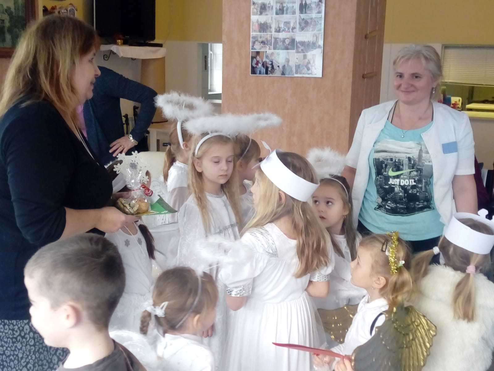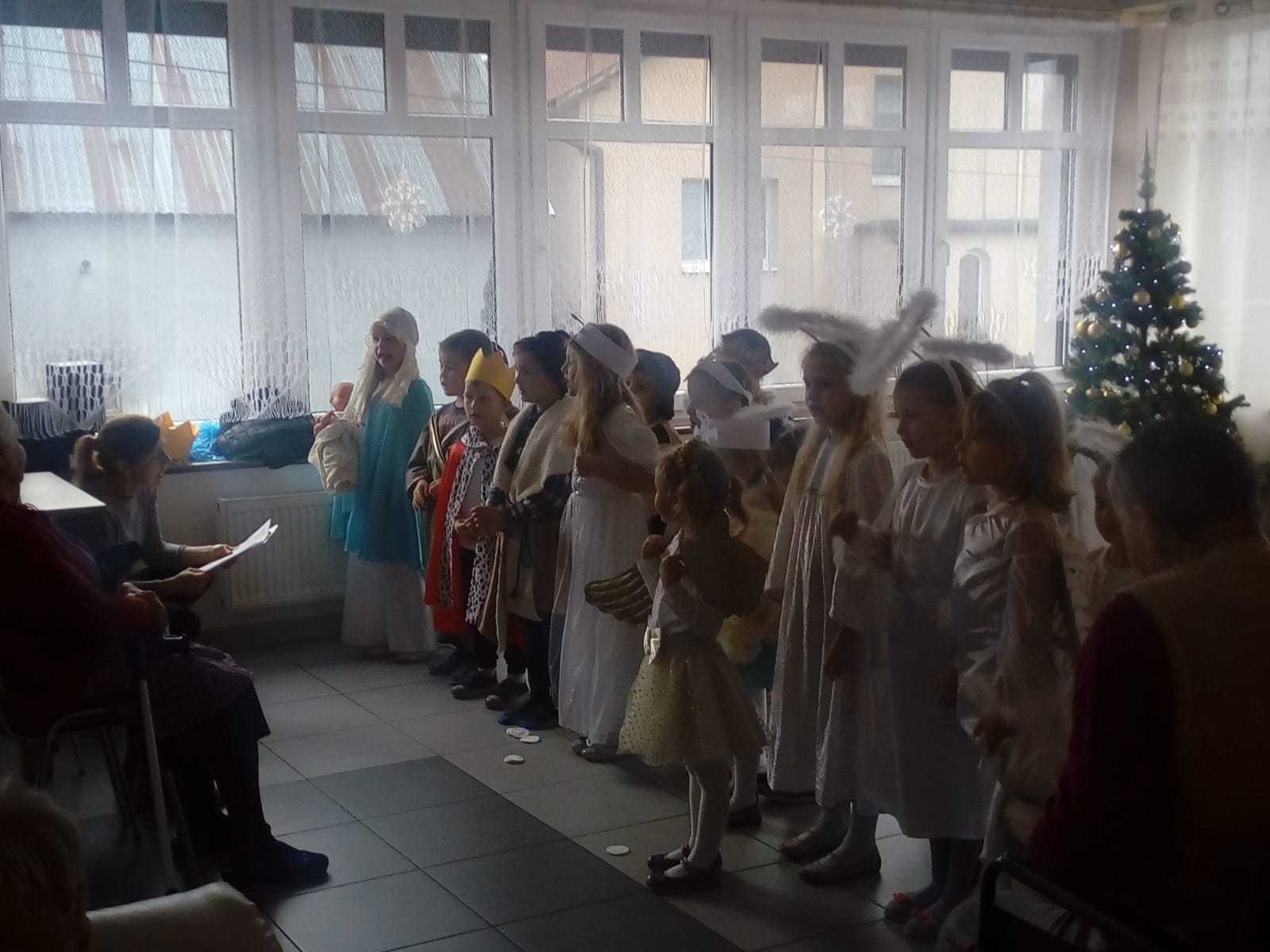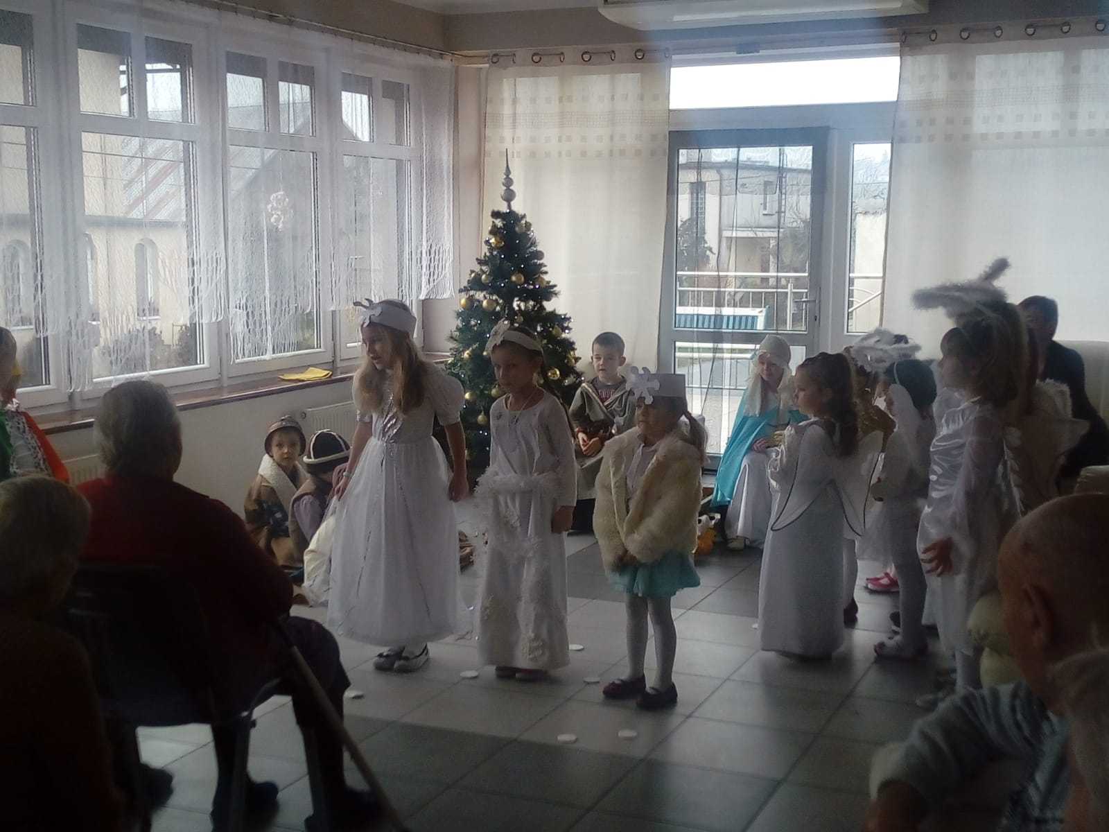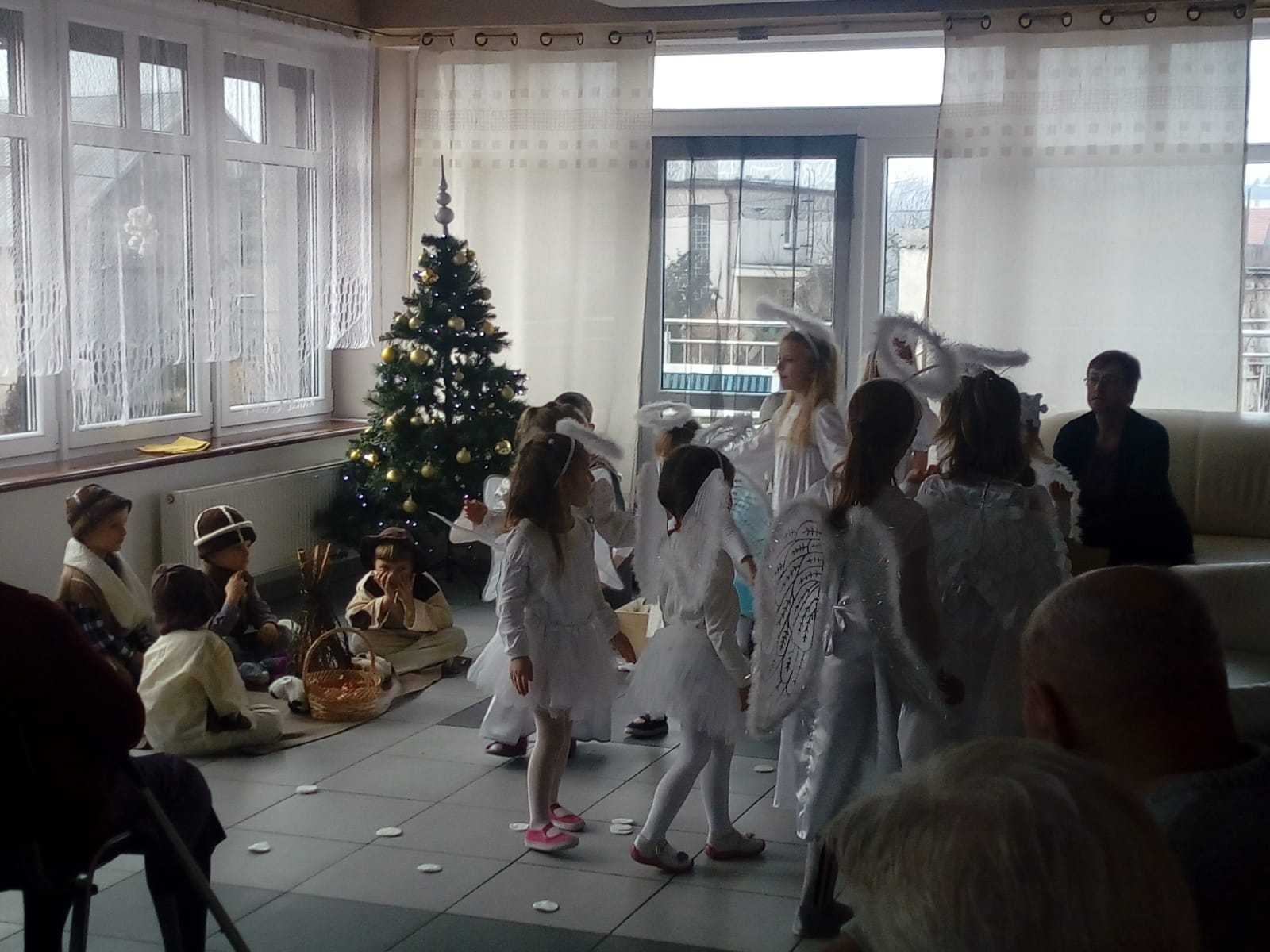 Dnia 17 grudnia przedszkolaki miały zaszczyt wystąpić ze swoim przedstawieniem jasełkowym przed starszymi ludźmi z Domu Opieki „Domowe Zacisze”. Dzieci pięknie przebrane recytowały swoje role, śpiewały kolędy, a na zakończenie podarowały pensjonariuszom samodzielnie zrobione kartki świąteczne z życzeniami oraz paczuszki z pierniczkami, które przedszkolaki również samodzielnie upiekły w przedszkolu. Starsi ludzi byli bardzo szczęśliwi, że mogli zobaczyć wspaniałe przedstawienie oraz byli wdzięczni, że się o nich pamięta. Niektórzy pensjonariusze płakali ze wzruszenia. Mamy nadzieję, że jeszcze kiedyś dla nich wystąpimy.