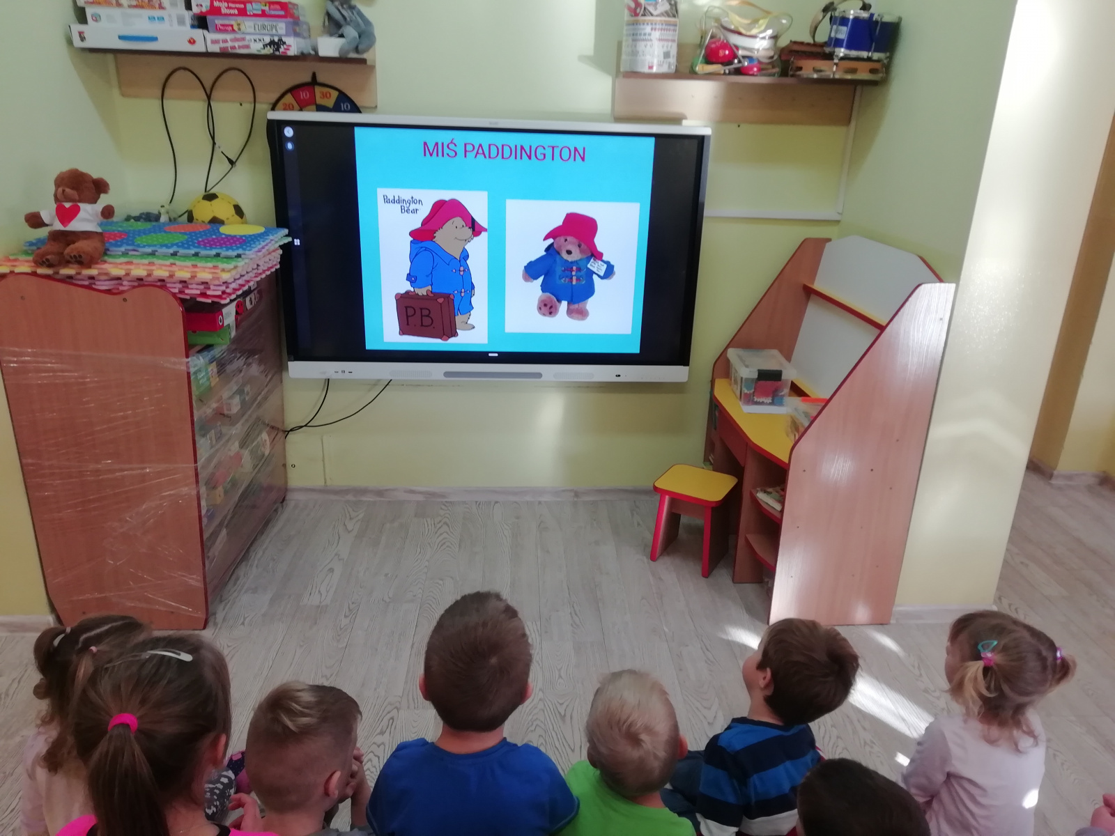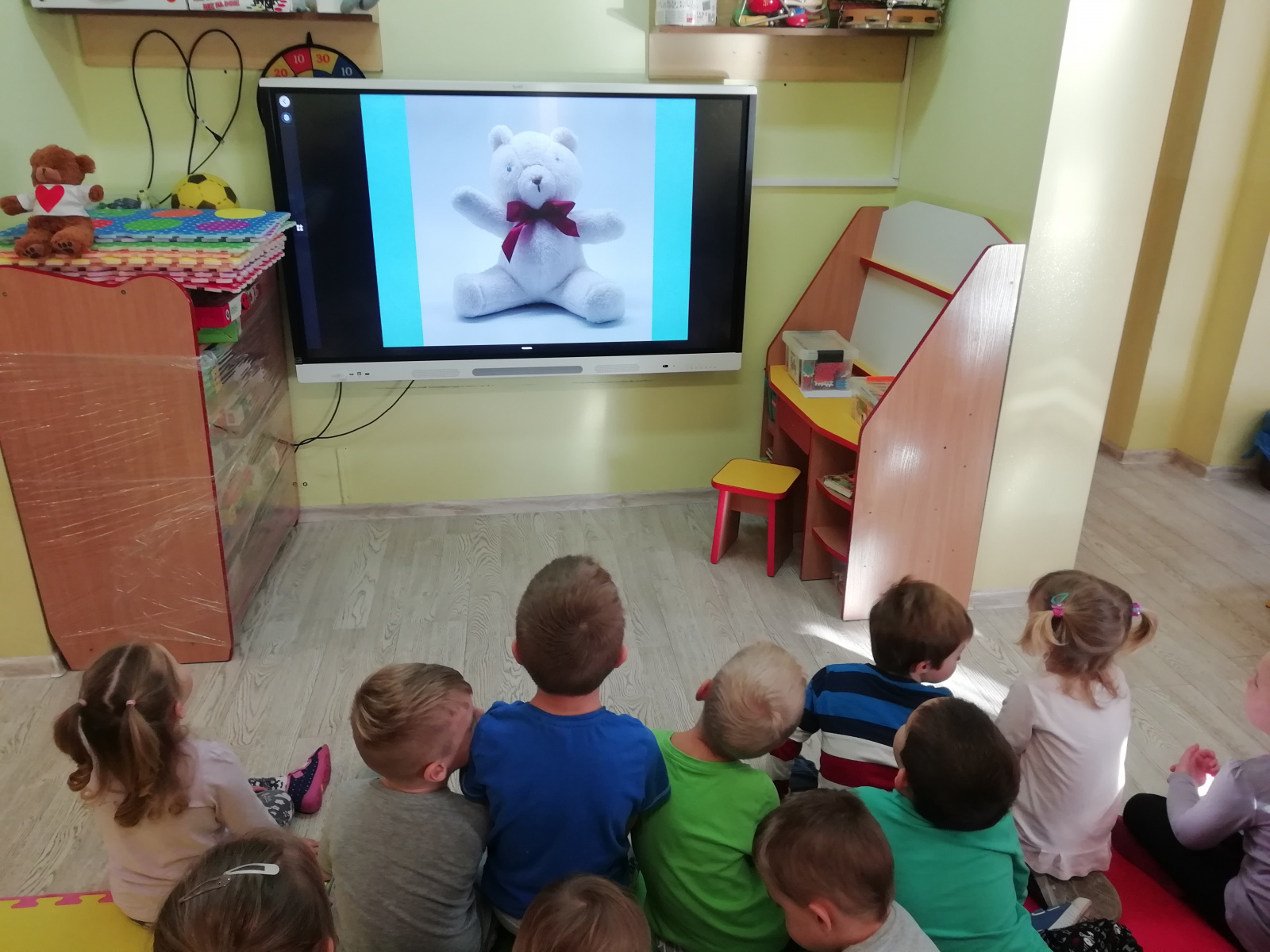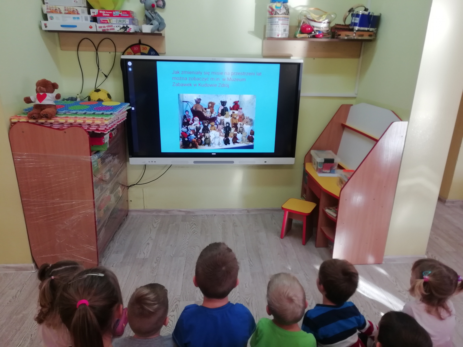 Przedszkolaki najpierw poznały historię powstania maskotki Misia. W tym roku prezentację na temat Pluszowego Misia mogły zobaczyć na nowym monitorze multimedialnym. Od niedawna cieszymy się nowym sprzętem i wykorzystujemy jego możliwości. Dziękujemy bardzo Panu Adamowi Porwal i firmie Henkel, dzięki którym uzyskaliśmy niezbędne na ten cel środki finansowe, oraz naszej nauczycielce Pani Agnieszce Kornas-Zuber, która przygotowała i przetłumaczyła wszystkie niezbędne wnioski na język angielski.