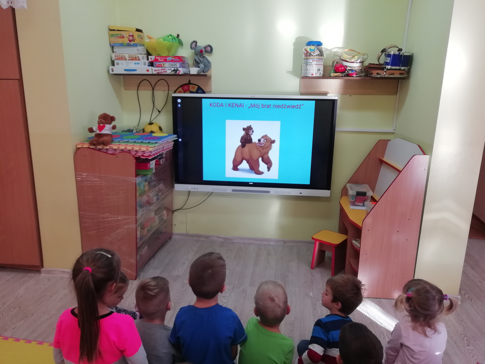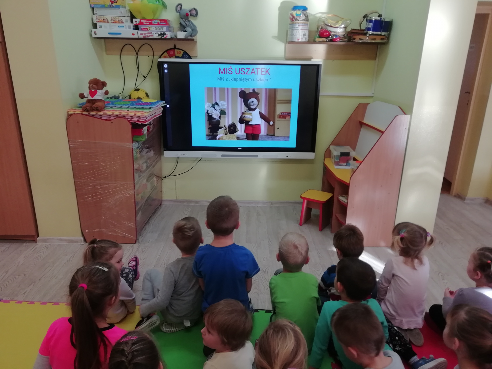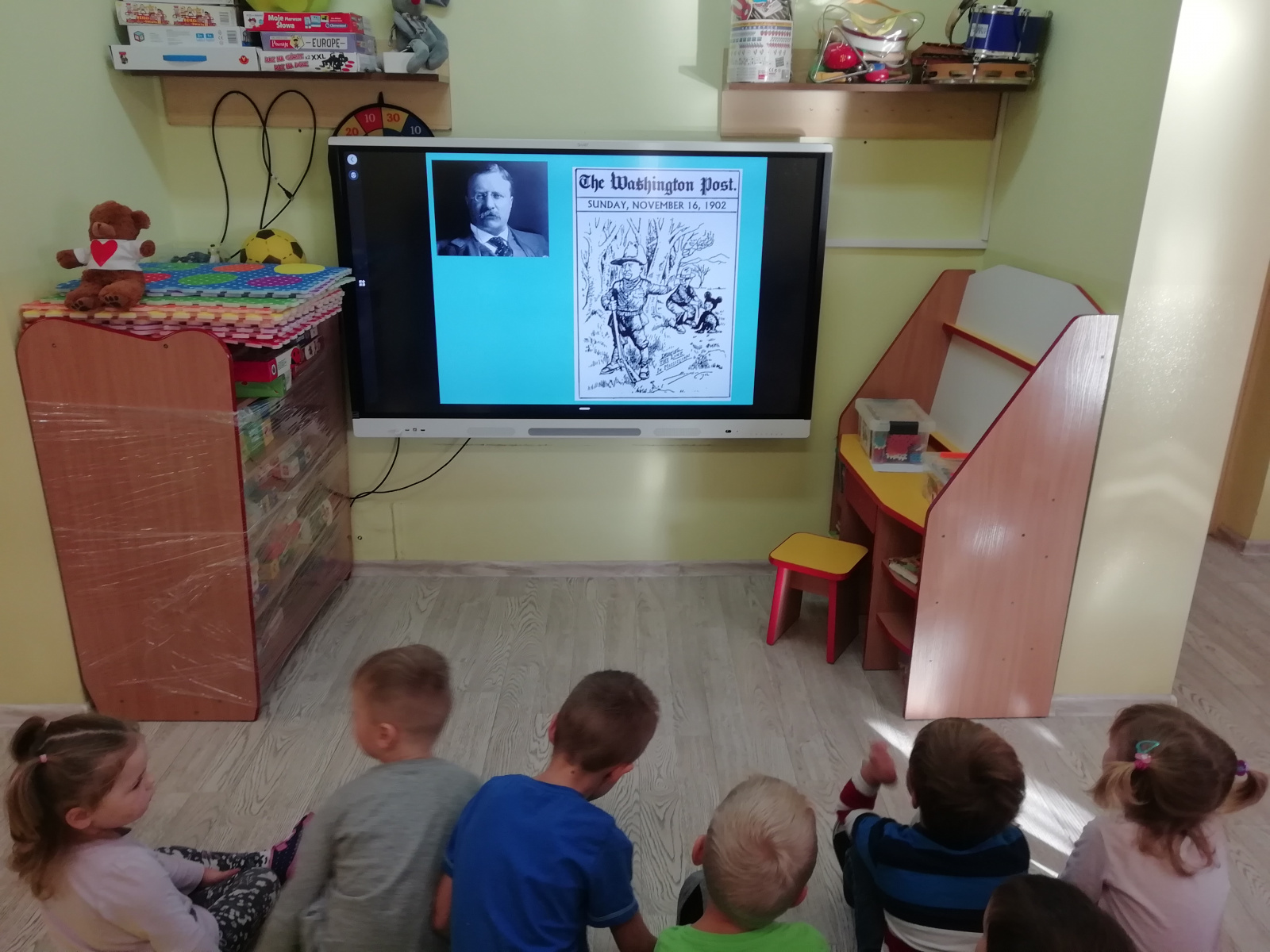 Przedszkolaki najpierw poznały historię powstania maskotki Misia. W tym roku prezentację na temat Pluszowego Misia mogły zobaczyć na nowym monitorze multimedialnym. Od niedawna cieszymy się nowym sprzętem i wykorzystujemy jego możliwości. Dziękujemy bardzo Panu Adamowi Porwal i firmie Henkel, dzięki którym uzyskaliśmy niezbędne na ten cel środki finansowe, oraz naszej nauczycielce Pani Agnieszce Kornas-Zuber, która przygotowała i przetłumaczyła wszystkie niezbędne wnioski na język angielski.