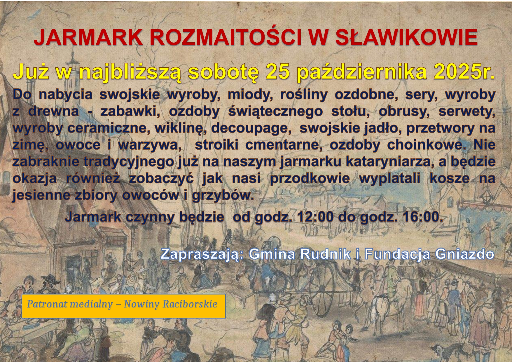 Serdecznie zapraszamy wszystkich na “Jarmark rozmaitości w Sławikowie”. Szczegóły wydarzenia znajdują się na załączonym plakacie.