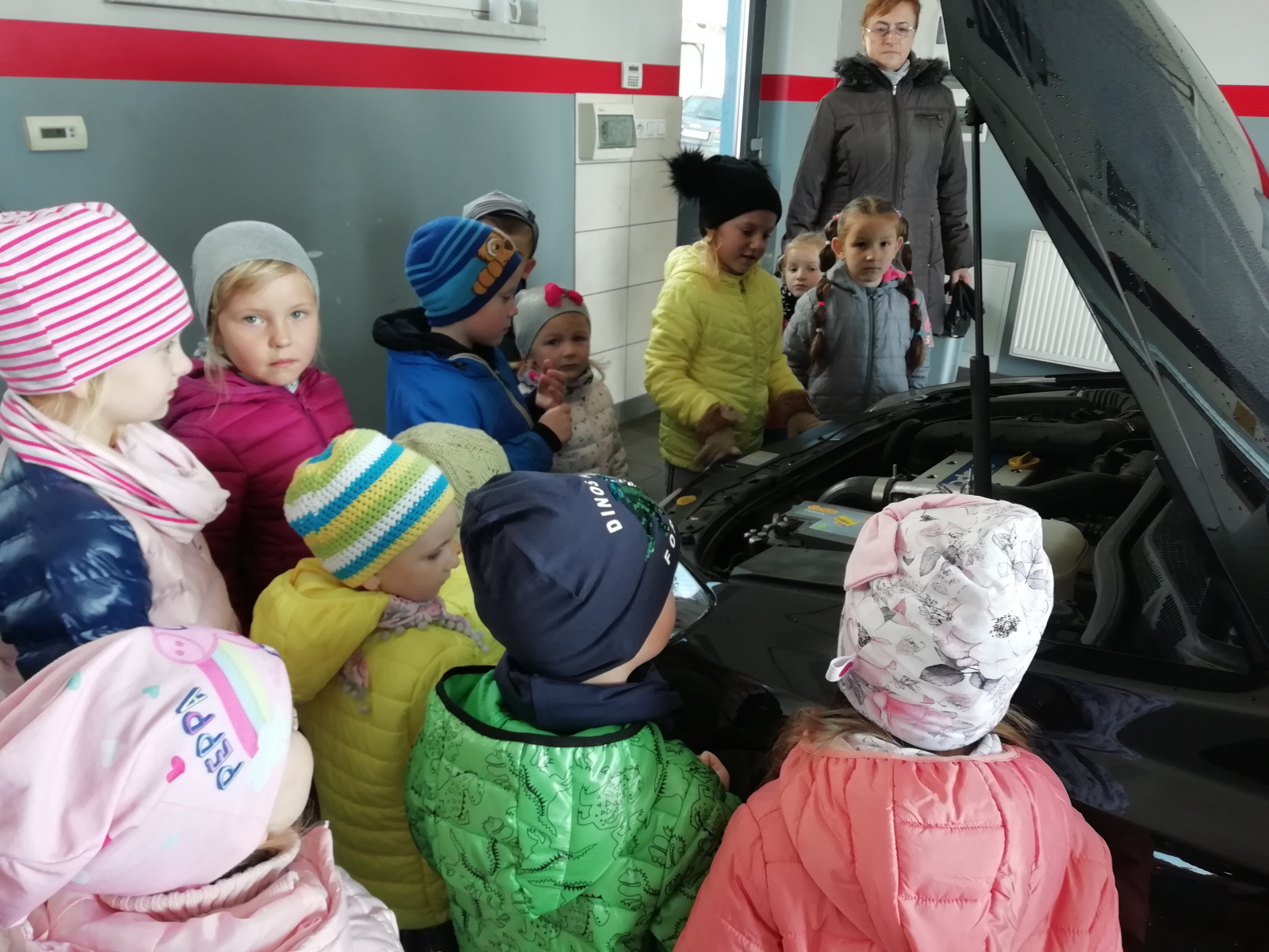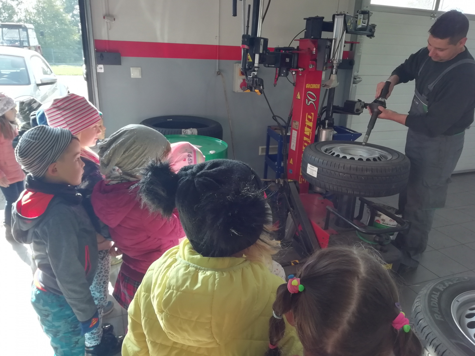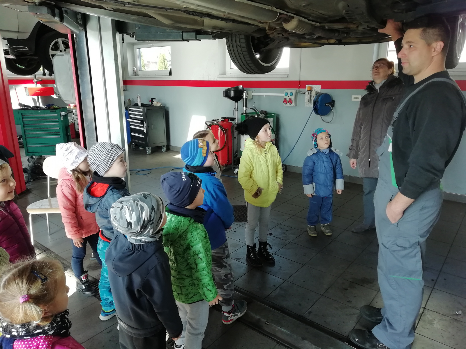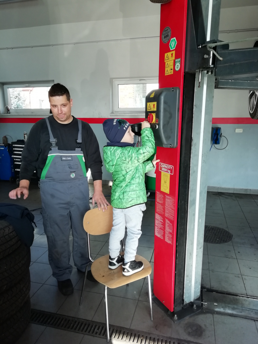 Dnia 7 października 2019 r. przedszkolaki z Grzegorzowic wybrały się na spacer po okolicy. Nie spodziewały się jednak, że to nie będzie zwykły spacer. Wycieczka bowiem zakończyła się w warsztacie samochodowym Pana Romana Kostki, który przyjął dzieci bardzo serdecznie, opowiedział o pracy mechanika samochodowego oraz pokazał wiele urządzeń i narzędzi, które na co dzień są niezbędne w jego pracy. Przedszkolaki same mogły przyciskać guzik podnoszący i opuszczający samochód oraz zobaczyły jak się ściąga opony z felg i na nowo zakłada. Na koniec Pan Roman poczęstował dzieci lizakami. Przedszkolaki zachwycone wróciły na obiad.