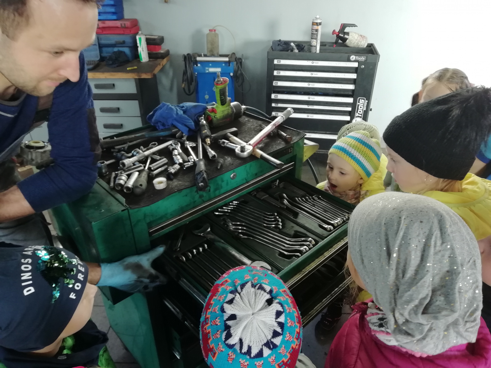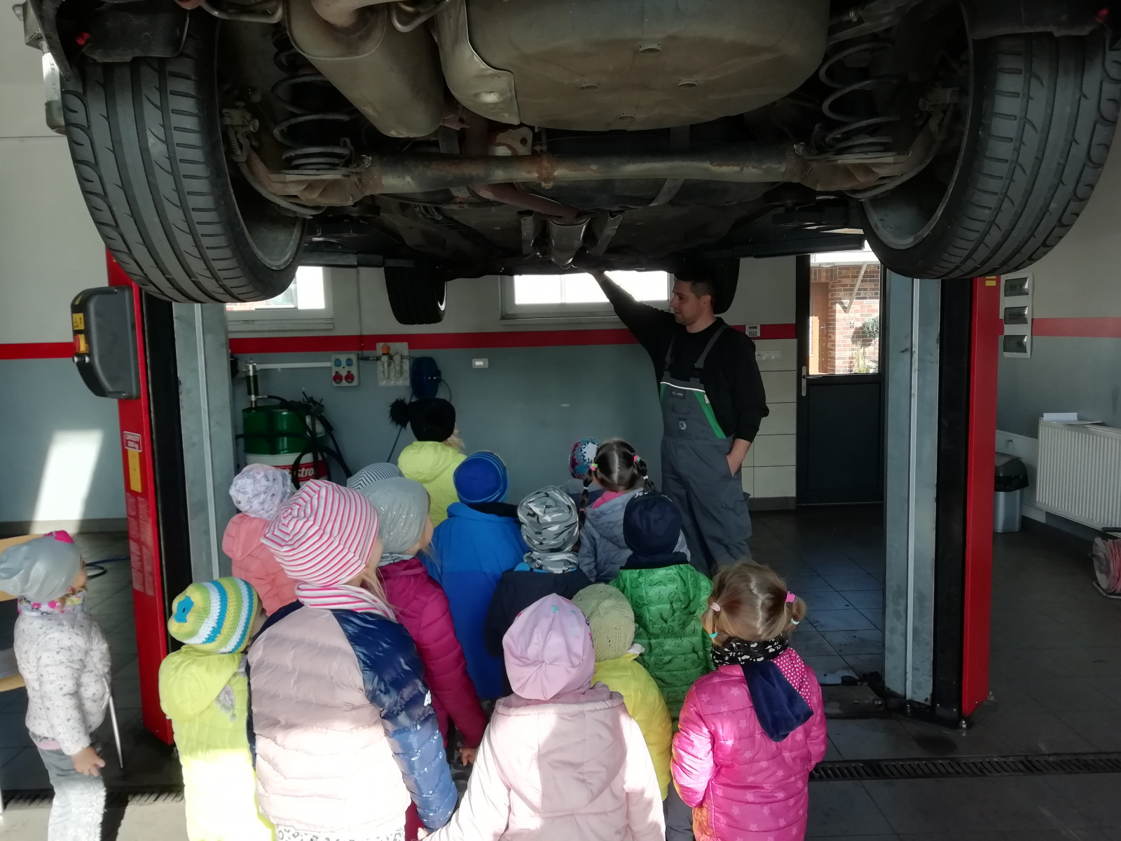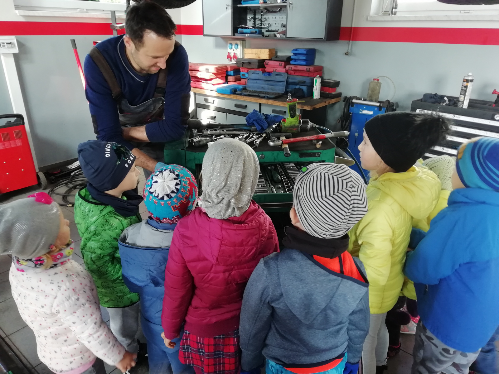 Dnia 7 października 2019 r. przedszkolaki z Grzegorzowic wybrały się na spacer po okolicy. Nie spodziewały się jednak, że to nie będzie zwykły spacer. Wycieczka bowiem zakończyła się w warsztacie samochodowym Pana Romana Kostki, który przyjął dzieci bardzo serdecznie, opowiedział o pracy mechanika samochodowego oraz pokazał wiele urządzeń i narzędzi, które na co dzień są niezbędne w jego pracy. Przedszkolaki same mogły przyciskać guzik podnoszący i opuszczający samochód oraz zobaczyły jak się ściąga opony z felg i na nowo zakłada. Na koniec Pan Roman poczęstował dzieci lizakami. Przedszkolaki zachwycone wróciły na obiad.