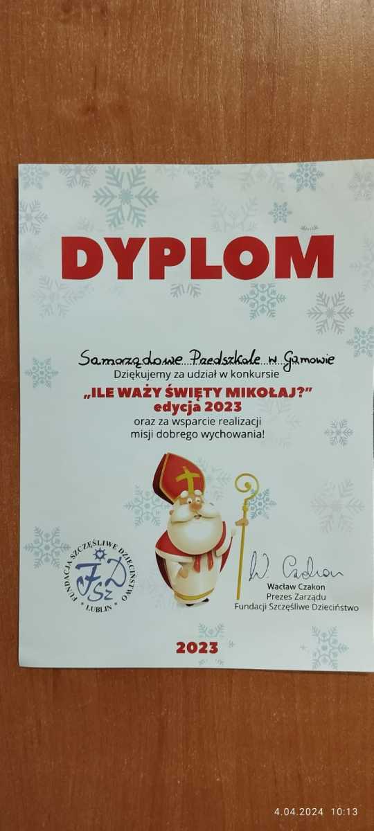 Samorządowe Przedszkole w Gamowie wzięło udział w charytatywnym konkursie „ Ile waży św. Mikołaj ?”, którego celem jest wsparcie Fundacji Szczęśliwe Dzieciństwo, prowadzącej placówki opiekuńczo- wychowawcze dla dzieci i młodzieży z trudnych środowisk. Zebrane środki pomagają utrzymać działalność fundacji oraz wspierają fundusz z którego wypłacane są stypendia.